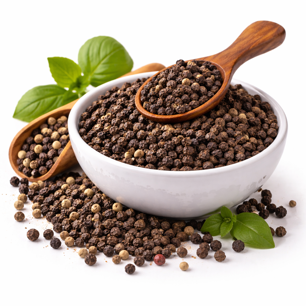 Premium whole black peppercorns known for bold aroma and natural heat, perfect for grinding fresh or tempering.