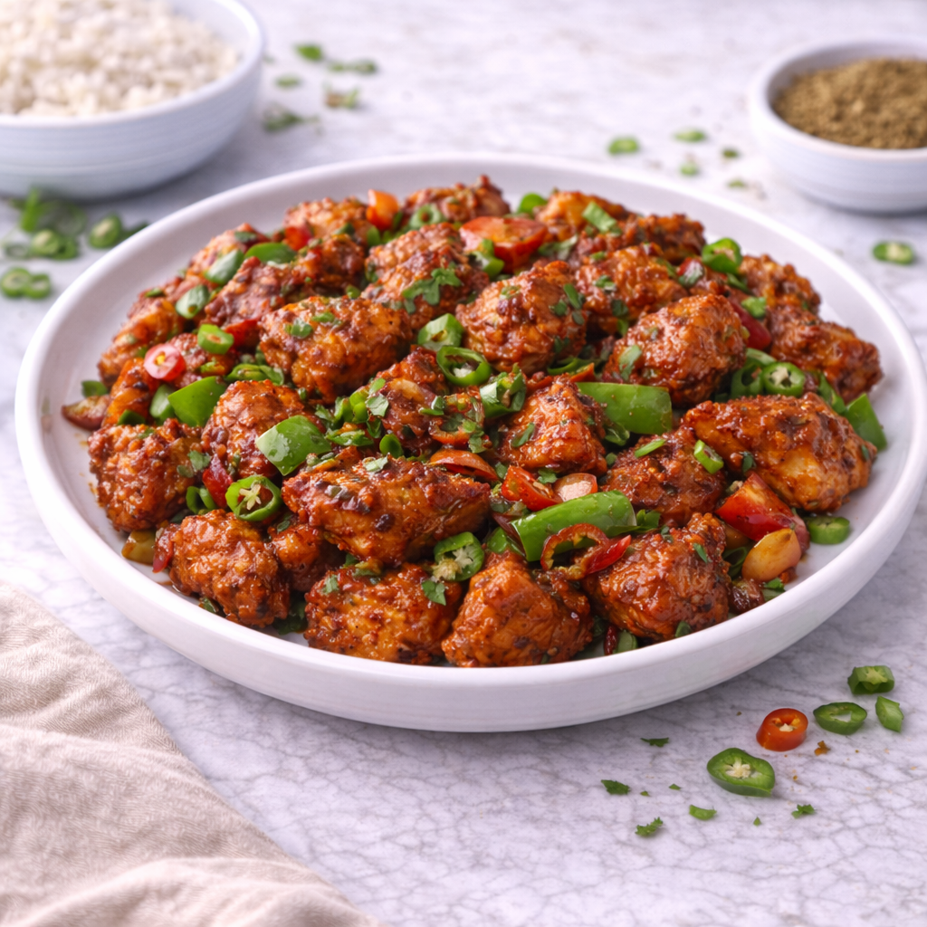 Crispy chicken pieces tossed in spicy chilli sauce, perfect as a starter or side dish.