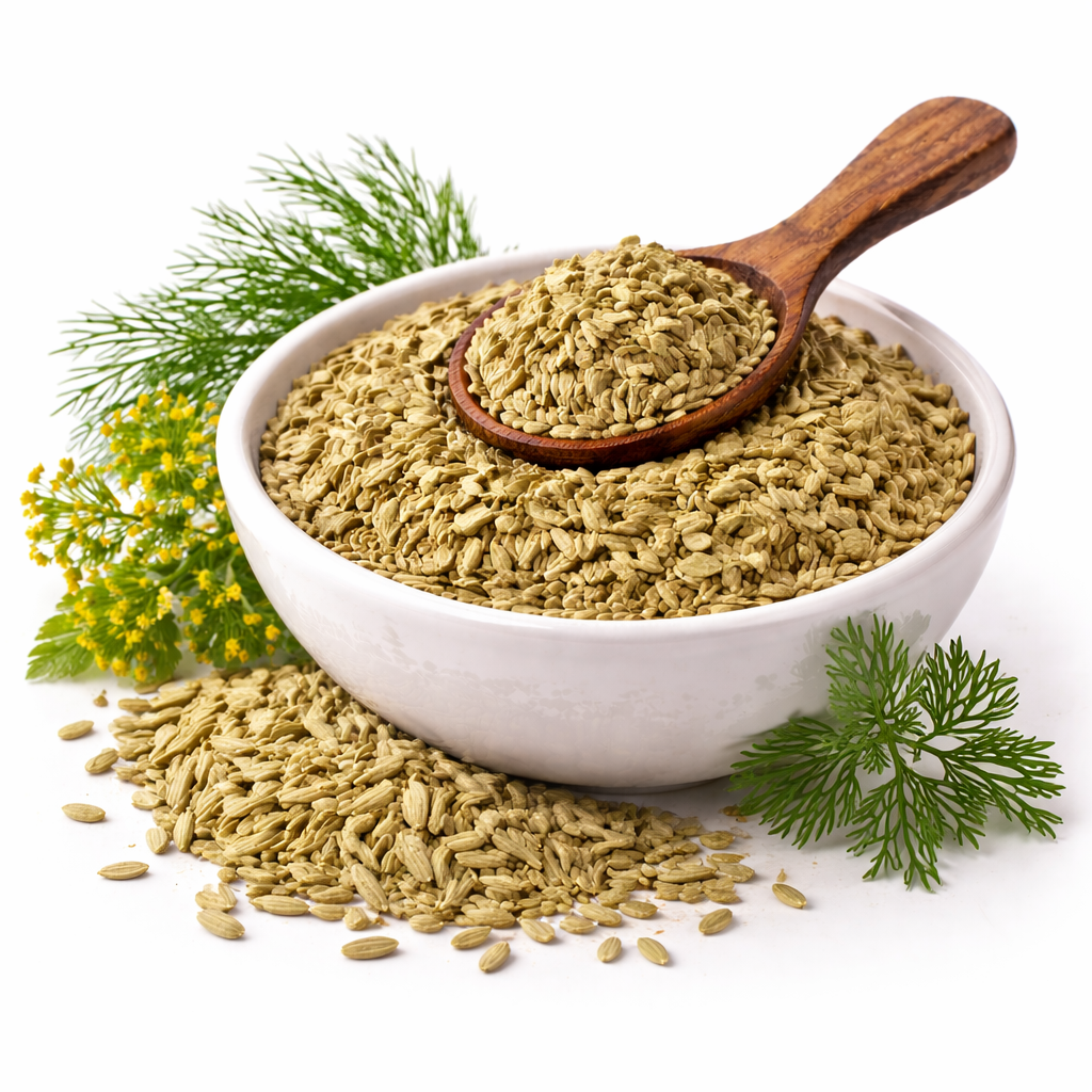 Sweet and aromatic fennel seeds used in spice blends, mouth fresheners, and digestive recipes.