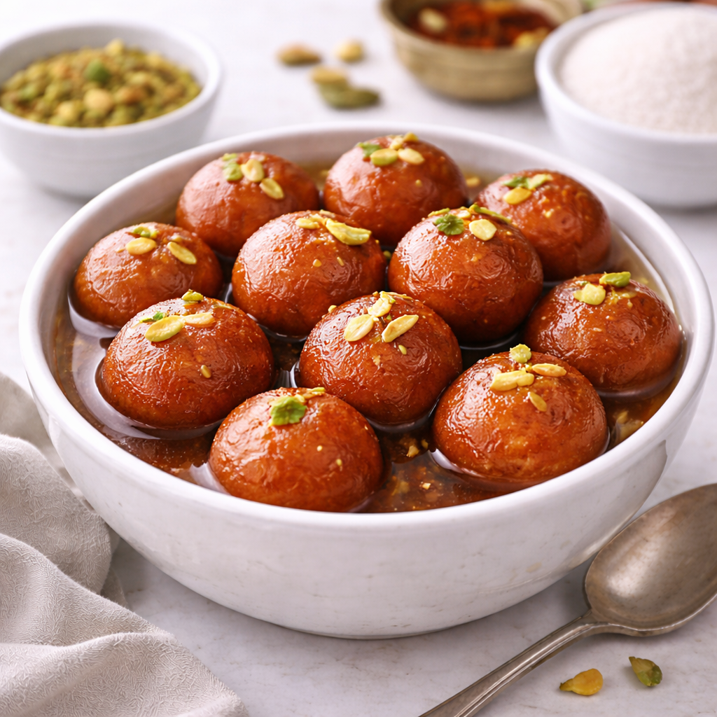 Classic Gulab Jamun with soft texture and rich syrup. Ready to serve dessert for restaurants and catering services.